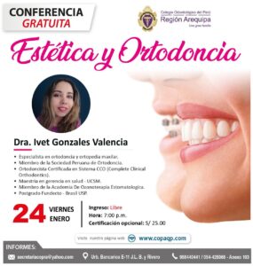 El Colegio Odontológico de Arequipa te invita a la Conferencia Gratuita: Estética y Ortodoncia, un evento exclusivo para conocer las últimas tendencias y avances en ortodoncia y estética dental.