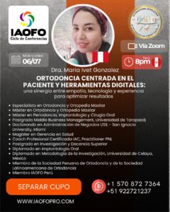 Nuestra Gerente General, la Dra. Maria Ivet González, participará como ponente en el ciclo de conferencias de la IAOFO 🌐 🦷 Tema: Ortodoncia centrada en el paciente y herramientas digitales Una experiencia única de aprendizaje y liderazgo peruano 💪🇵🇪